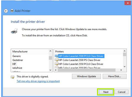 - At this step, you will have to go to the printer's manufacturer's website to download the associated Basic Drivers and then point to it by clicking the Have Disk... button