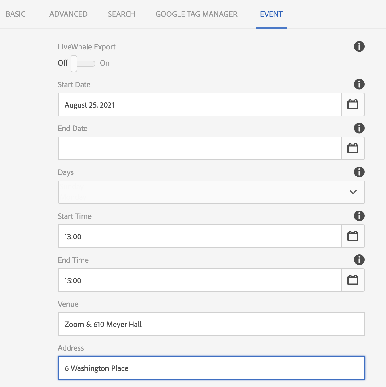 Only enable the LiveWhale Export IF you want the event to be publicly listed on the NYU Calendar system. If the event is only to be listed on the PSYCH website, leave LiveWhale Export turned off.