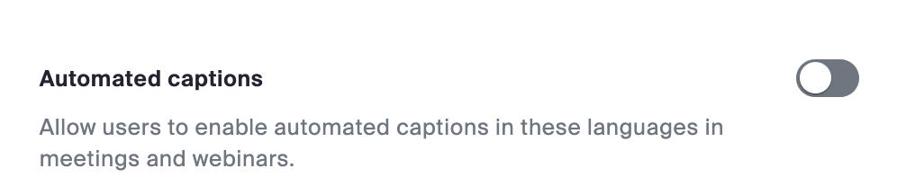 To block the ability to allow users to enable automatic either toggle off the Automated captions toggle or check the box to "Allow only the following users to enable captions for the meeting or webinar.":